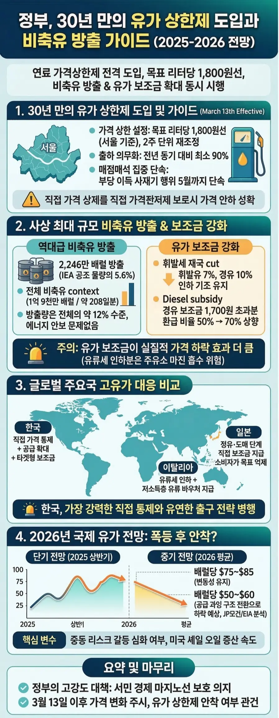 정부, 30년 만의 유가 상한제 도입과 비축유 방출 가이드 (2025-2026 전망)