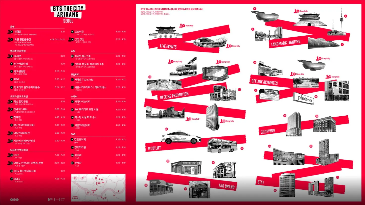| 3/20–4/19 | BTS THE CITY ARIRANG SEOUL | 서울 도심 전역 | BTS 테마 도시 프로젝트, 스탬프 랠리 포함 |