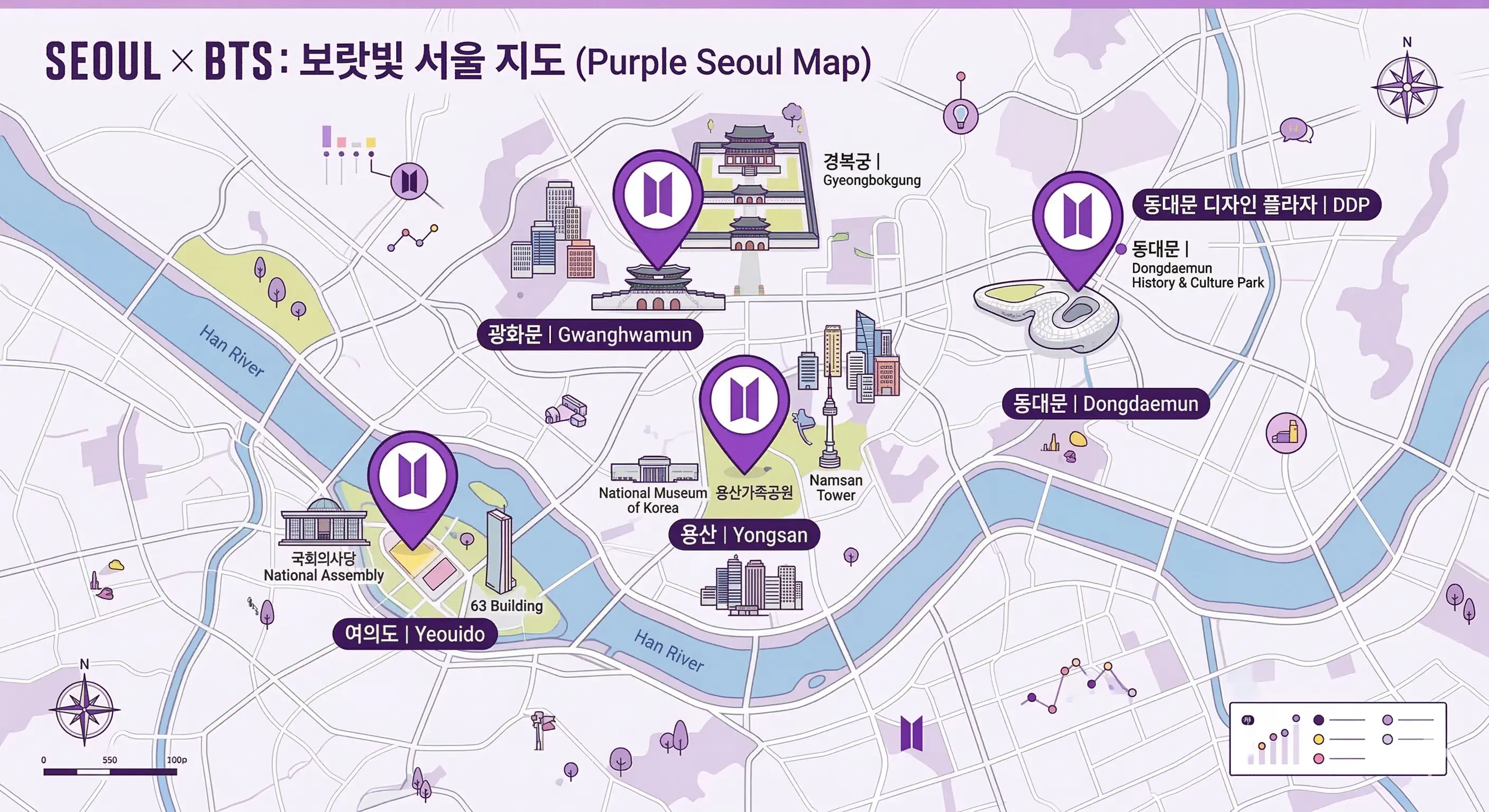 - 2일차: 경복궁/북촌 관광 → 신세계 본점 팝업 → 광화문 광장 컴백 라이브(또는 넷플릭스 관람) → 숭례문 야경