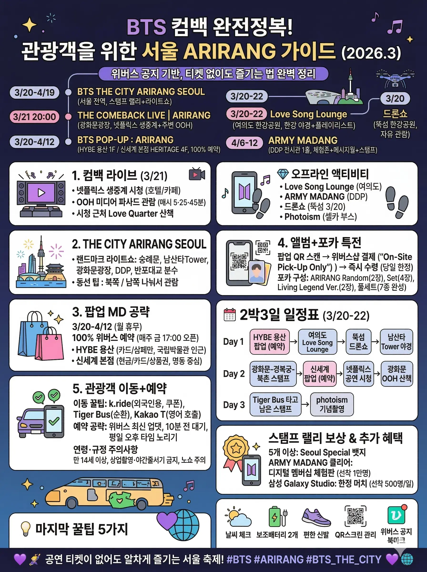 2026년 BTS의 서울 컴백은 도시 전체를 하나의 거대한 축제장으로 탈바꿈시켰습니다. 사전 예약 시스템(위버스)을 얼마나 잘 활용하느냐가 이번 투어의 성패를 가를 핵심입니다. 철저한 예약과 동선 계획으로 잊지 못할 아리랑 서울 여행을 즐기시길 바랍니다.